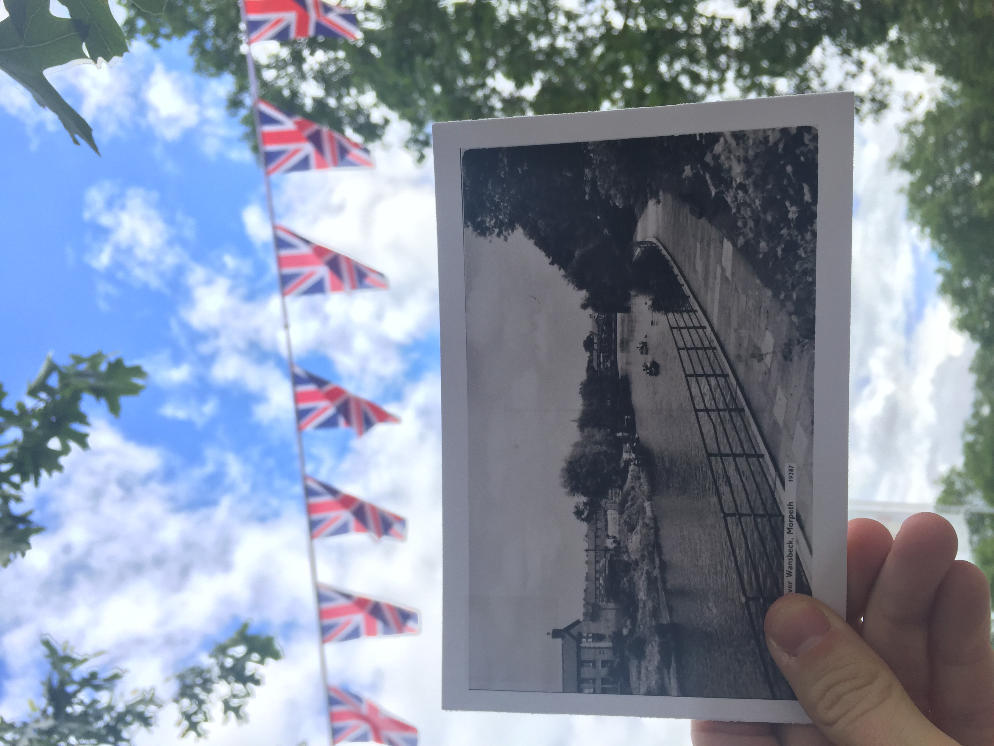 Judie wanted me to put this card around London. It’s an image of the town her mother was born in and her grandmother left for London to find a husband. I left this card under these flags in the park next to the Saatchi gallery.