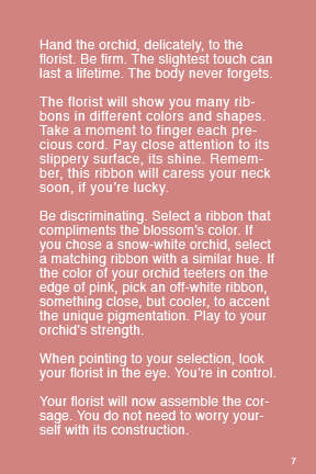 An instruction manual also accompanies each floral arrangement. These manuals dictate how to recreate each arrangement using a variety of official languages and colloquial terms cribbed from a mixture of how-to guides, advice columns, and pop culture references. These rambling texts oscillate from funny to scathing, direct to bewildering, entertaining to dry and irritating.